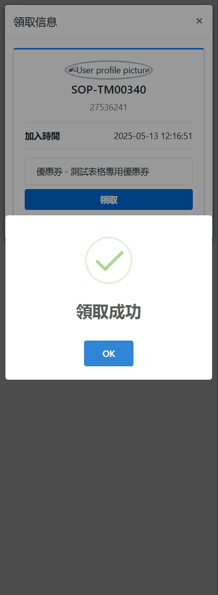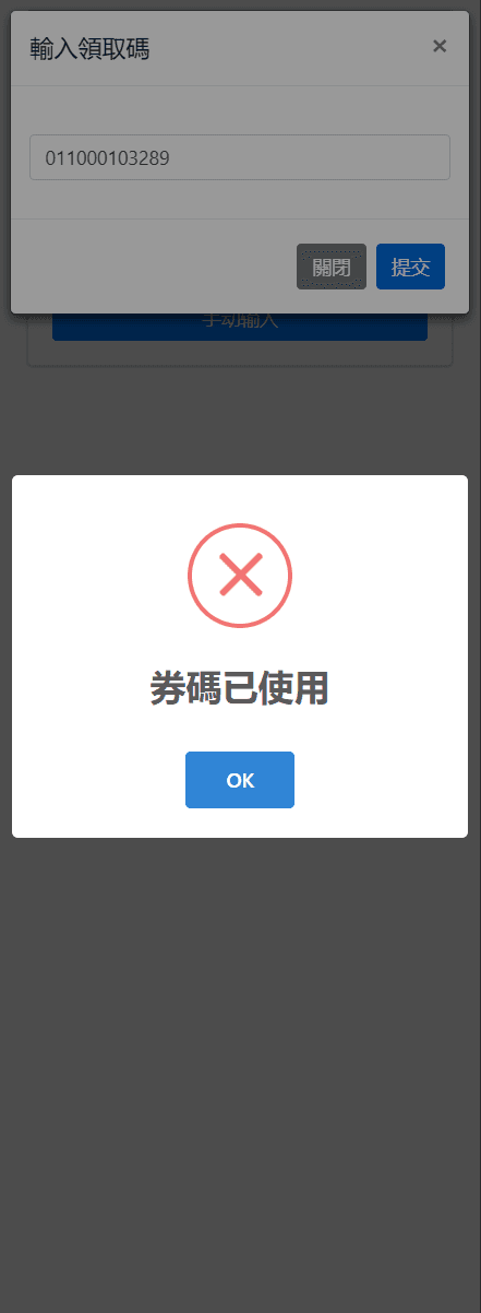 輸入之後會顯示該優惠券的名字跟領取按鈕,點擊領取就可以領取成功了,再次使用該券碼領取會顯示券碼已使用